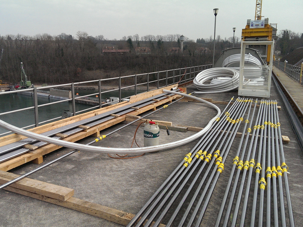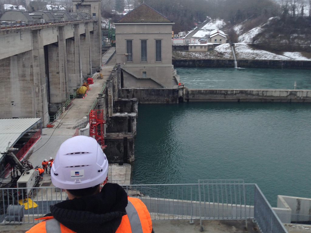 Located on the border between Avully (not Chancy as its name might suggest), in the canton of Geneva and the town of Challex (not Pougny) in the department of Ain, it is operated by the industrial Services of Geneva and the national company of the Rhone. GTM France has provided length rods 3-5 m between M60 and M170 to strengthen the foundations of the dam in grade steel HTSR