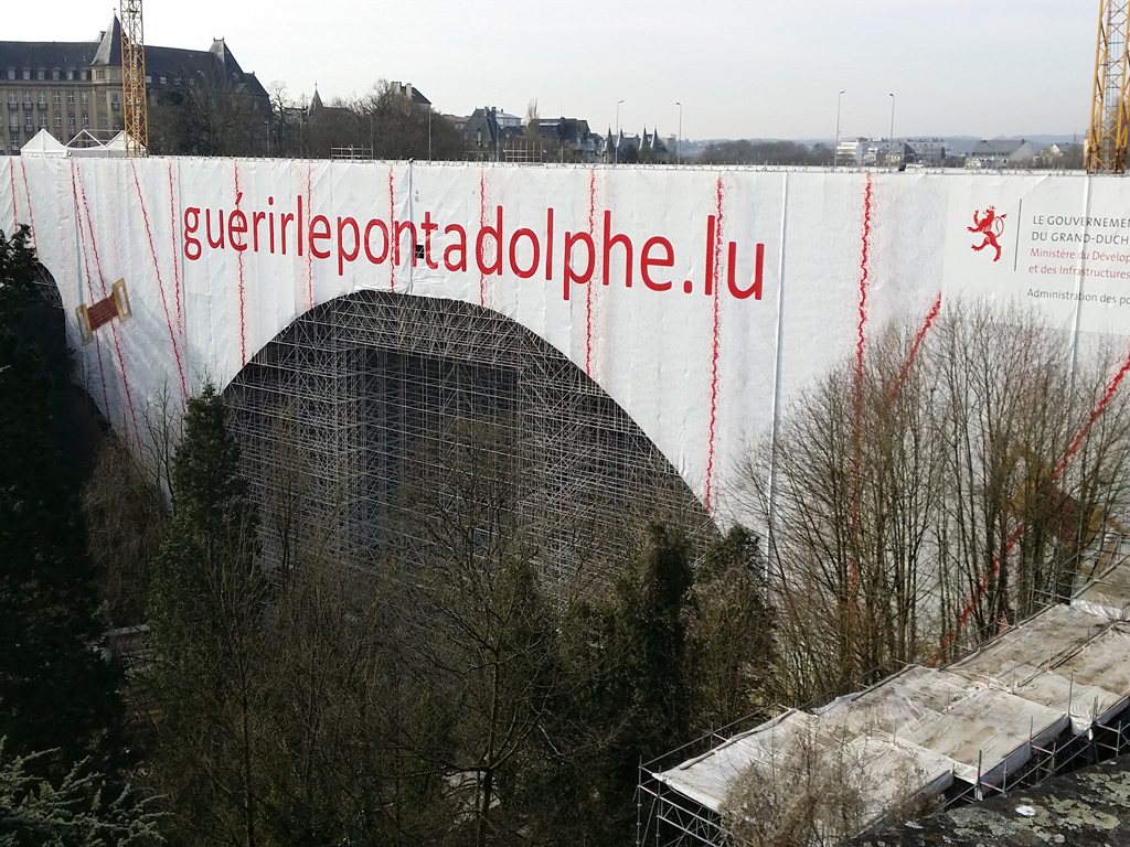 Die 100 Jahre alte Adolphe- Brücke leidet unter diversen Mängeln, die eine umfassende Sanierung erzwingen. Zu der Behebung der Mängel beinhaltet das Projekt die Erweiterung der Brückenplatte und die Bebauung einer zweigleisigen Straßenbahn. Während der Renovierung wurde der Verkehr bekanntlich über ein blaues Stahlbau – Provisorium, welches parallel zur Brücke verläuft, umgeleitet, um den fließenden Verkehr während der Baumaßnahme nicht zu stören.
